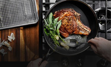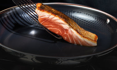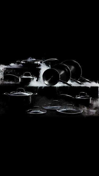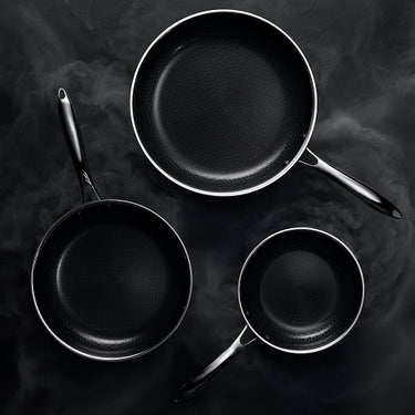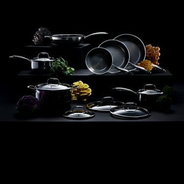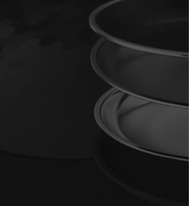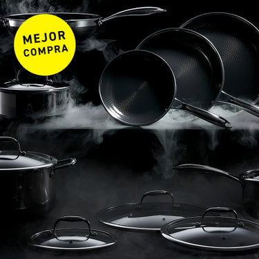 Nuestros sartenes híbridos combinan el rendimiento del acero inoxidable, el antiadherente cerámico y el hierro fundido, todo el poder en uno.